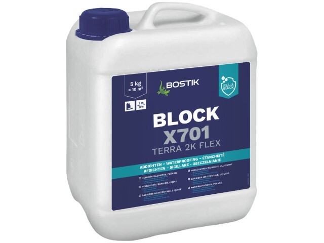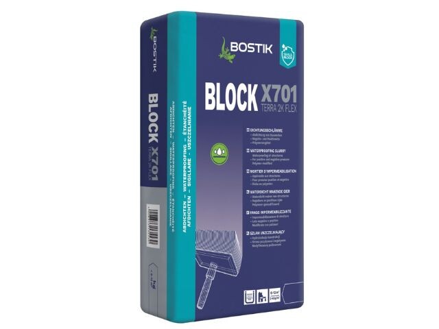 BOSTIK BLOCK X701 TERRA 2K FLEX jest dwuskładnikową zaprawą hydroizolacyjną o bardzo dobrej przyczepności do podłoży mineralnych. Jest szybko obciążalny, odporny na działanie wody pod ciśnieniem, do stosowania od wewnątrz i od strony działania wody (strona negatywna oraz pozytywna).