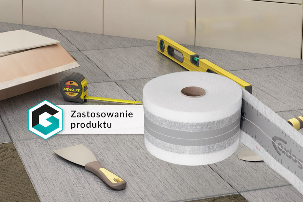 W naroża i szczeliny dylatacyjne wbudować taśmę po wcześniejszym lekkim uformowaniu. Technologia nie wymaga pokrywania środkowej części taśmy uszczelnieniem, niezbędne jest natomiast dokładne pokrycie uszczelnieniem flizelinowych brzegów taśmy. Z kolei w obszarze łączenia kolejnych odcinków taśmy/narożników, wymagane jest stosowanie co najmniej 5 cm zakładu i obustronne pokrywanie uszczelnieniem/klejem montażowym obszaru styku w celu zachowania szczelności złącza.