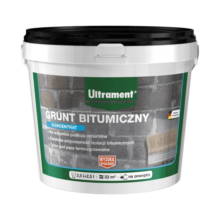 Grunt bitumiczny należy wymieszać z czystą wodą w stosunku 1:1. Grunt jest dostępny w ilości 2,5 L w wiaderku o pojemności 5 L. Do wiaderka należy dolać do pełna czystej wody i wymieszać. Tak przygotowany materiał nanosimy wałkiem, pędzlem lub szczotką na podłoże. Grunt nanosić cienką warstwą tak, aby unikać powstawania błyszczącej powierzchni.