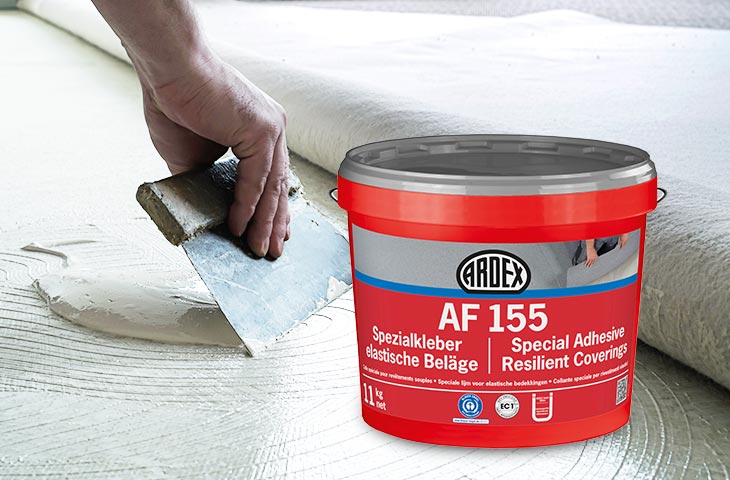 Wykładziny, które będą układane muszą być składowane w danym pomieszczeniu, w którym będą prowadzone prace by przyswoić temperaturę i wilgotność. Klej ARDEX AF 155 należy równomiernie rozprowadzić na przygotowane podłoże za pomocą odpowiedniej pacy zębatej. Czas wstępnego odparowania zależy od temperatury i wilgotności powietrza w pomieszczeniu i może wynosić około 20 minut przy chłonnym podłożu do 60 minut przy podłożu niechłonnym. Przy układaniu wykładzin gumowych i wykładzin wielowarstwowych z PVC należy nanieść klej tylko taką warstwą i na takiej powierzchni by układając wykładzinę, układać ja w mokrym kleju. Podczas wykonywania prac należy kontrolować systematycznie powierzchnie zwilżenia i kontaktu wykładziny z klejem i podłożem. Układanie wykładzin należy prowadzić tak, aby nie było pęcherzy – kieszeni powietrznych, załamań i pozawijanych krawędzi. Po około 40 minutach, wykładzina musi być wygładzona i dociążona walcem o wadze min. 50 kg. Kolejne prace można prowadzić po około 24 godzinach.