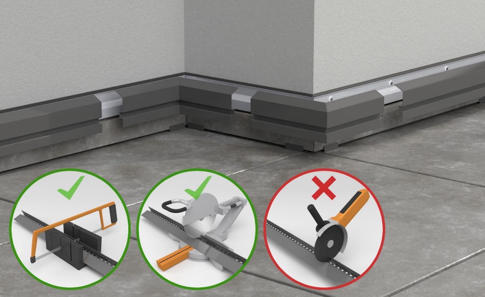 Po ułożeniu płytek cokołowych wymierzamy i docinamy profile C2. Cięcie powinno odbywać się wyłącznie ręcznym brzeszczotem lub piłą mechaniczną z tarczą zębatą. Niedopuszczalne jest cięcie profili szlifierką kątową, aby uniknąć uszkodzenia materiału.