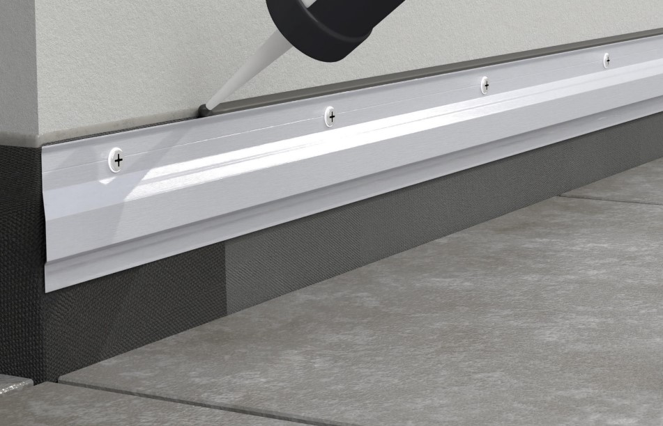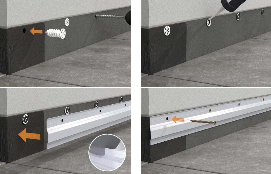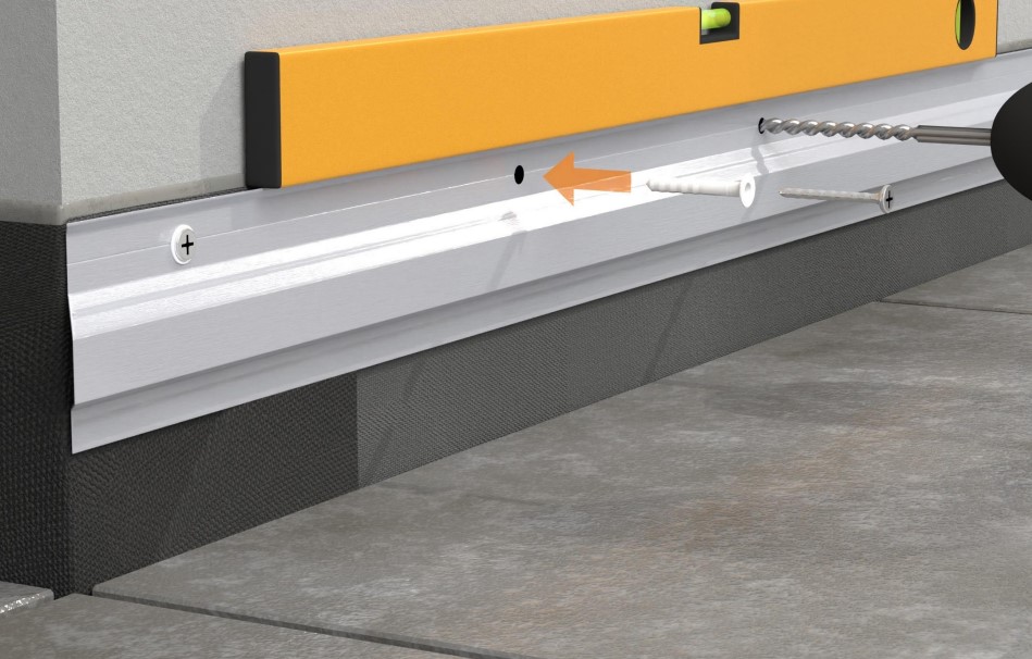 Przed ich osadzeniem należy wywiercić otwory prowadzące. Po dokręceniu śrub, nanieść na ich talerzyki niewielką ilość poliuretanowej masy uszczelniającej. Następnie przyłożyć profile do ściany i dokręcić je do śrub ślimakowych, dbając o poziome ustawienie profili oraz równomierne dociśnięcie membrany do podłoża.