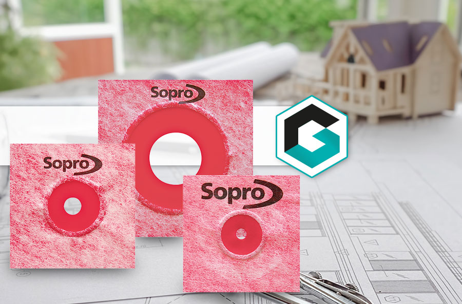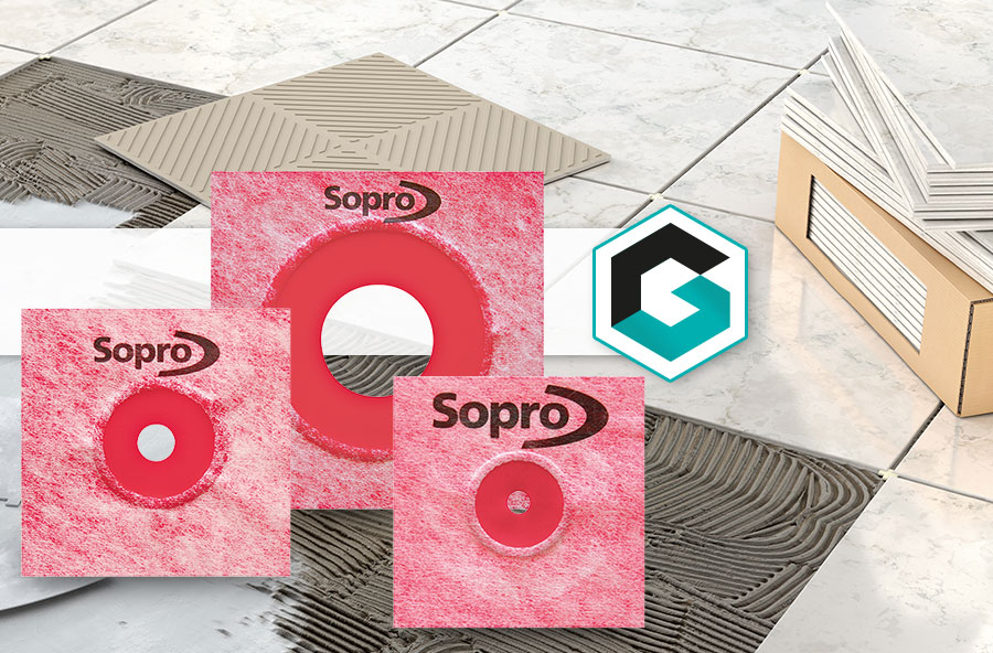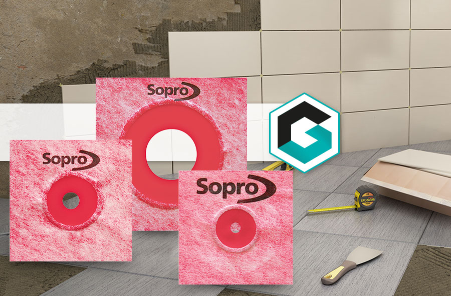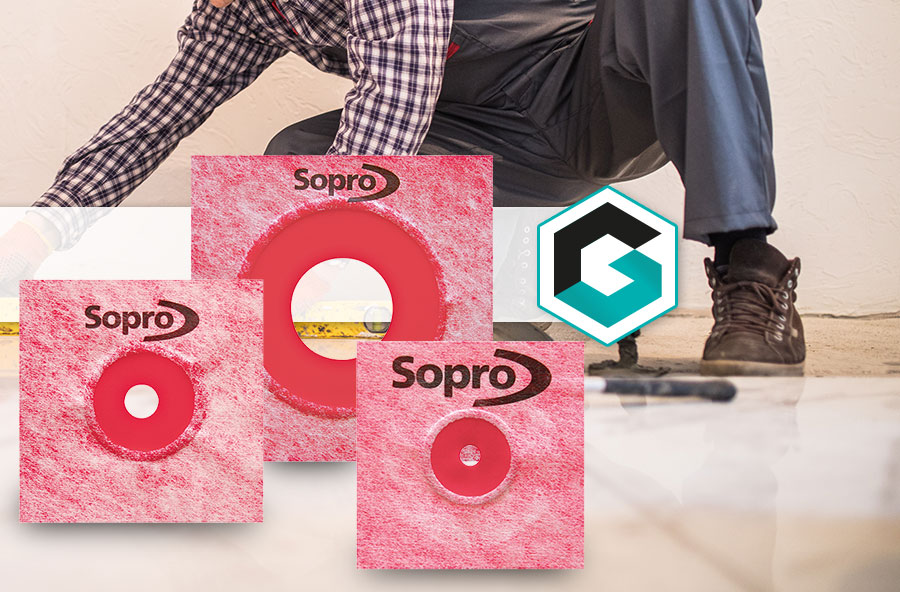 W przypadku zastosowania w systemie z matami uszczelniającymi uszczelkę przykleić na wcześniej zabudowanej macie, nakładając ją na rurę przepustową i wkleić całą powierzchnią w co najmniej 50 mm pas kleju montażowego Sopro Racofix® RMK 818 lub zaprawy uszczelniającej Sopro TDS 823.