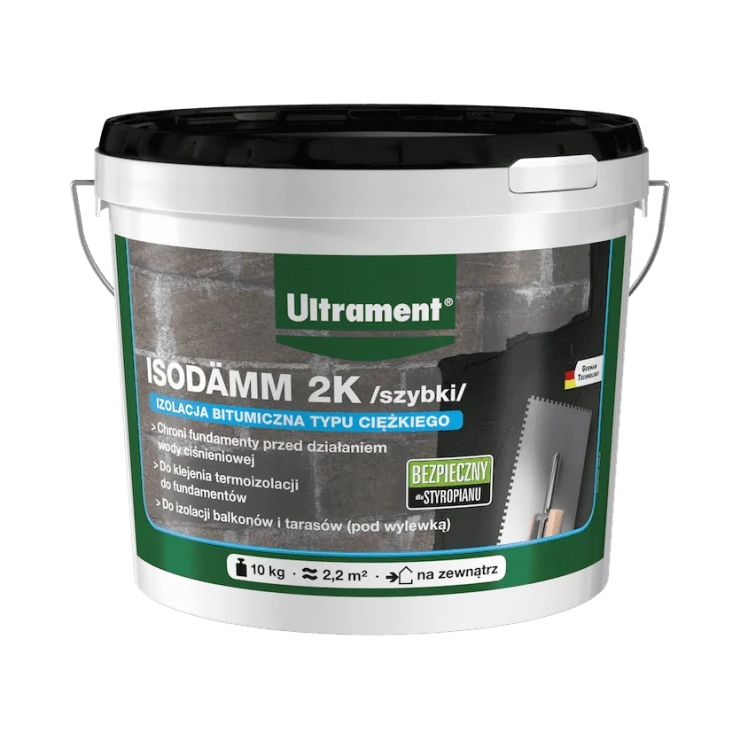 ISODÄMM 2K /szybki/ jest dwukomponentowym, bezrozpuszczalnikowym materiałem przeznaczonym do wykonywania izolacji średnich i ciężkich, na powierzchniach pionowych i poziomych. Dzięki nowoczesnej recepturze wzmocnionej włóknami zabezpiecza części budowli poniżej powierzchni gruntu oraz stykających się z gruntem przed wilgocią, a także wodą wywierającą i niewywierającą ciśnienie. Dodatkowo wysoka elastyczność umożliwia mostkowanie pęknięć i rys nawet do 2 mm. Produkt polecany do wykonywania izolacji przeciwwilgociowych fundamentów oraz pod warstwami ochronnymi np. z jastrychu, na powierzchniach podłogowych piwnic, balkonach, tarasach, jak również do przyklejania płyt termoizolacyjnych i drenażowych. Jako podłoża nadają się beton, tynki cementowe i cementowo-wapienne, jastrychy oraz mury pełnospoinowe powszechnie występujące w budownictwie.