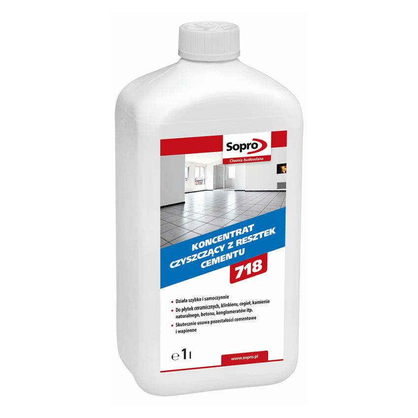 Do usuwania nieorganicznych zanieczyszczeń, jak pozostałości nalotów cementowych, osadów wapiennych, rdzy, zatłuszczeń, resztek mydła, powszechnie występujących (nieorganicznych) zabrudzeń i osadów oraz różnego rodzaju wykwitów ze wszystkich, niewrażliwych na działanie kwasów okładzin, jak płytki ceramiczne, płyty klinkierowe, ceglane i gliniane, płyty Cotto, beton elewacyjny, a także z kamieni naturalnych (granitów lub nieobrobionych wapieni), wielu tworzyw sztucznych oraz chromu, stali szlachetnej itp. Koncentrat Sopro ZE 718 stosuje się przede wszystkim do czyszczenia typowych zabrudzeń budowlanych w pomieszczeniach (preparat do stosowania w pomieszczeniach i na zewnątrz).